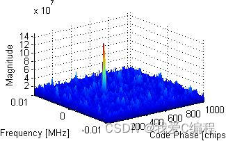然后对得到的结果取模。当获得超过门限的峰值,则说明此时信号已经捕获,就得到对码相位和多普勒频移估计值,这样做的有点是可以获得峰值更为明显的谱线。