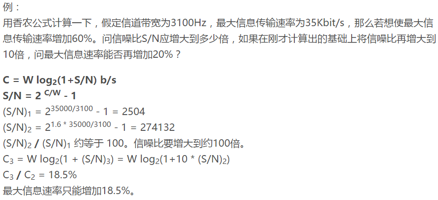 信道的带宽或信道中的信噪比越大,则信息的极限传输速率就越高。 只要信息传输速率低于信道的极限信息传输速率,就一定可以找到某种办法来实现无差错的传输。 实际信道上能够达到的信息传输速率要比香农的极限传输速率低不少。