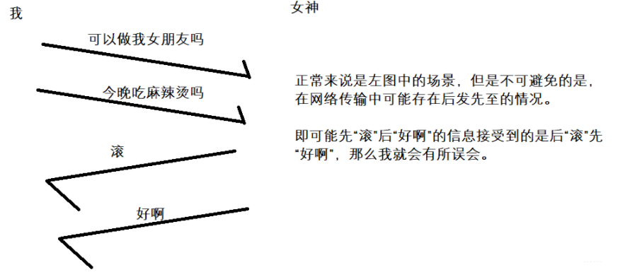 由于网络上的传输,接受到的顺序是不确定的,因此不能就单纯的按照通过收到的顺序来确定逻辑.因此此处引入了序号和确认序号,即在协议格式中出现的序号和确认序号.