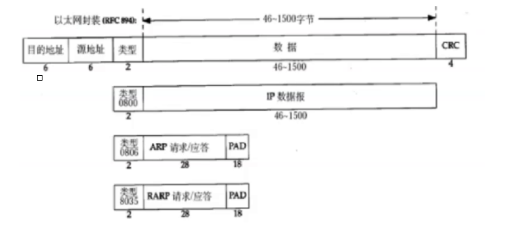 类型中就是上面以太网数据帧的类型选择,0800,0806,8035. 0800指的是数据里面存储的是IP数据报 ;0806指的是数据里面存储的 是ARR请求/应答;8035指的是数据里面存储的是RARR请求/应答.数据的长度不能小于46-1500字节.