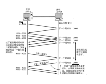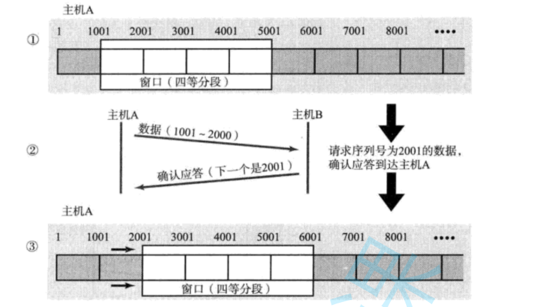 当窗口范围为1001-5001,就说明发送方现在同时发送了1001-2000.2001-3000.3001-4000,4001-5000.此时就在同时等待四组数据的ACK.