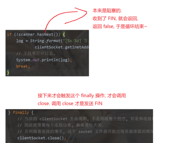 2.表面上看是调用了socket.close()方法发送的FIN,本质上是内核里面释放了对应的PCB的文件描述符 如:虽然代码中没有调用close,但是socket对象被GC回收了,也是可能会关闭释放对应的文件描述符的.(这个操作没有那么及时),再比如:代码中虽然没有调用close,但是进程结束了,对应的PCB就会随之销毁,而PCB里面包含文件描述符表也被销毁了,进一步的文件描述符也被销毁了..就同样会触发FIN.