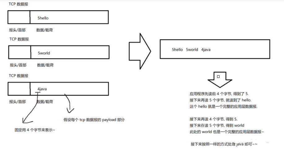 解决粘包问题的方式:通过设置一个合理的 应用层协议来解决. 1.给应用层数据设定结束符/分隔符 2.给应用层数据设定长度. 两种方式的核心就是要明确应用层数据中,报和报之间的边界.