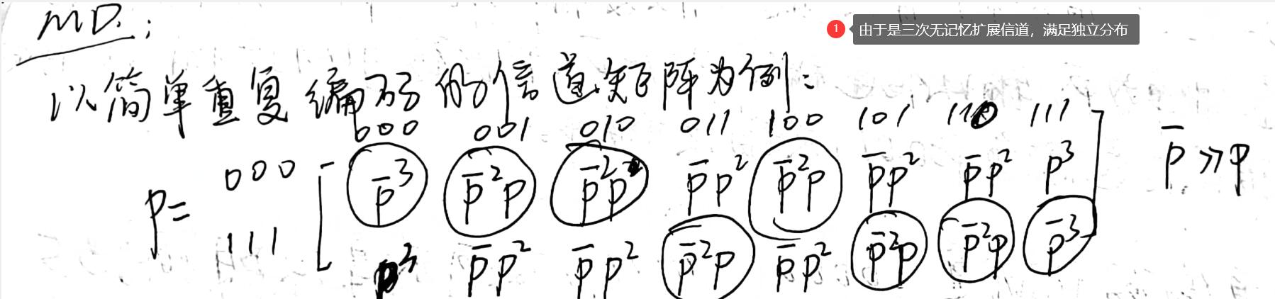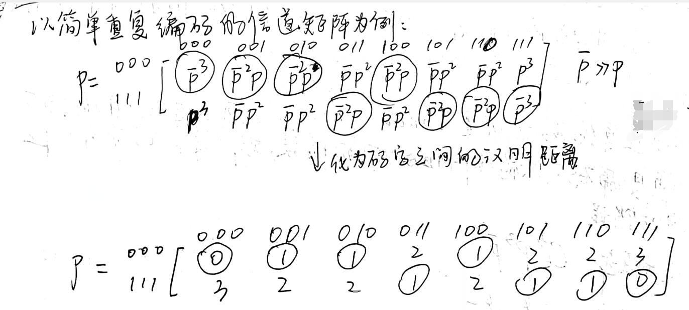 第二步:假如是等概率输入,所有译码准则所对应的转移概率之和乘以为正确概率,其余矩阵元素之和乘以