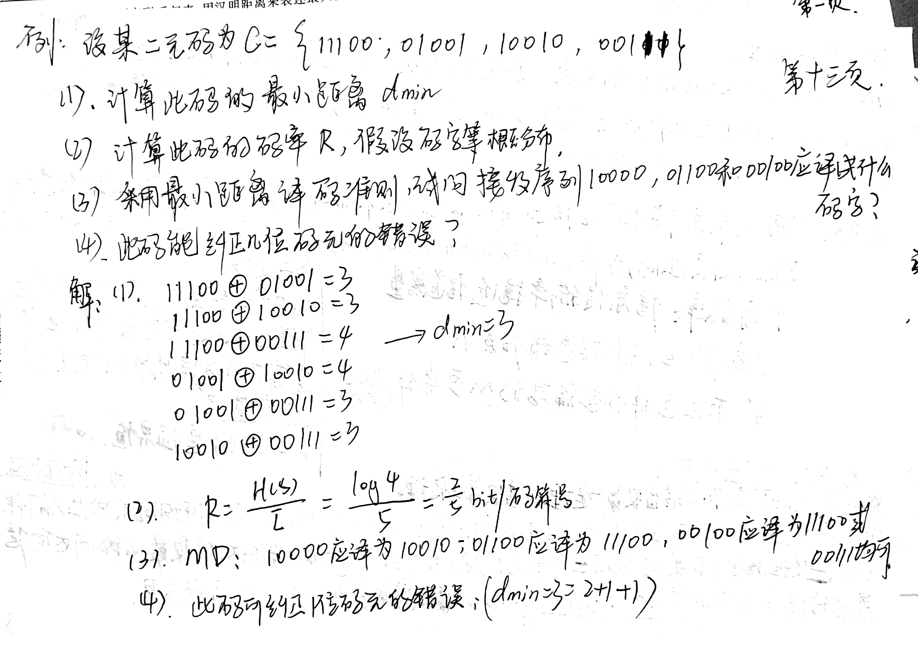 - 在某一码C中,任意两个码字的汉明距离的最小值称为该码C的最小距离。最小距离