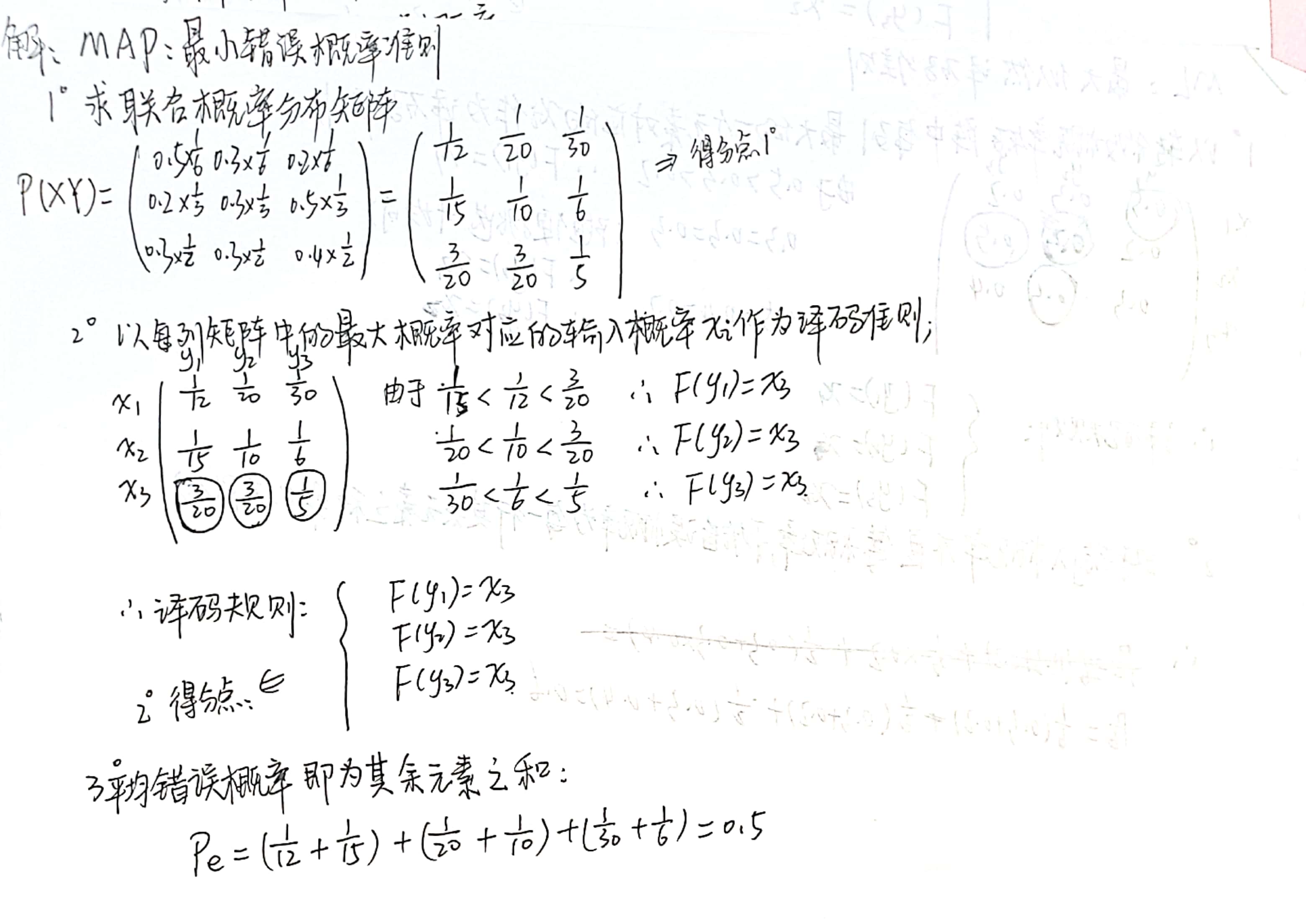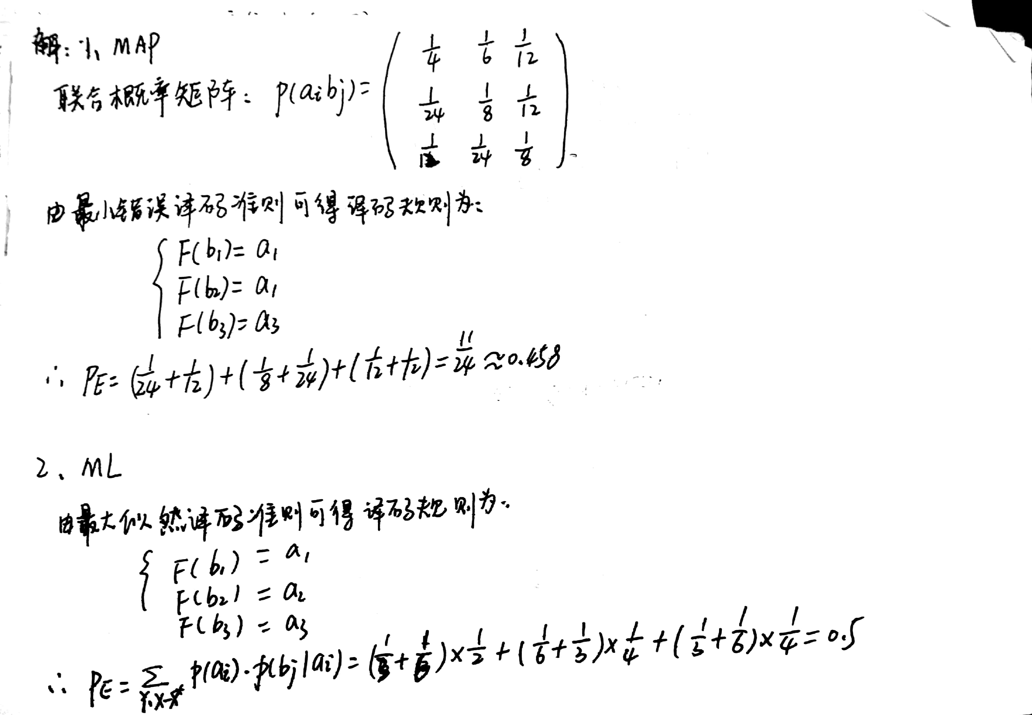 ,分别根据最小错误概率准则和最大似然译码准则确定译码规则,求得平均错误概率。(第一个栗子我详细写,其余内容都一样,不再详细,所以你一定要先看懂我第一个栗子。)