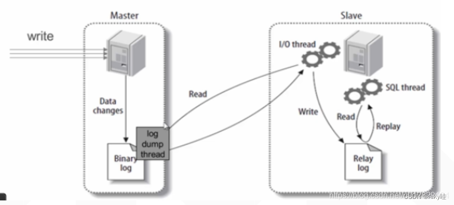 以下是一张经典的MySQL通过binlog实现主从数据同步的原理图: