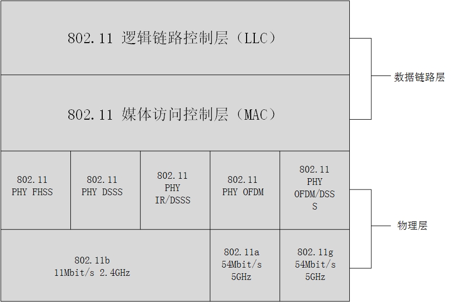 数据链路层主要负责将网络层的数据信息无差错的传输到相邻节点的目标网络层中。从上图中可以看出,基于IEEE802.11b标准实现的WiFi技术工作在2.4GHz频段,并且采用FHSS、DSSS和IR等关键技术;基于IEEE802.11a标准实现的WiFi技术工作在5GHz频段,并且采用OFDM技术;基于IEEE802.11g标准实现的WiFi技术工作在5GHz频段,并且采用DSSS/OFDM技术。
