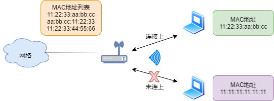 在 AP 中设置允许关联的 MAC 地址列表,只有在列表里面的 STA 才能连上无线网络,防止以外的 STA 接入 AP ,这个方法叫做 MAC 地址过滤或 MAC 地址认证。