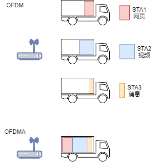 用卡车来货来解释这个技术最方便直观了。OFDM 技术是为每一个客户发一次货车。不管货物多少,来一单发一趟,这样不免就有货车空载的现象。而 OFDMA 技术会将多个订单合在一起发货,让卡车尽量满载上路,使得运输效率大大提升。