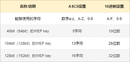 WEP 一共有三种加密方式:40 bit 长度的密钥和 24 bit 长度的初始向量值组成 64 bit 长的加密方式,104 bit 长度的密钥和 24 bit 长度的初始向量值组成 128 bit 长的加密方式,128 bit 长度的密钥和 24 bit 长度的初始向量值组成 152 bit 长的加密方式。密钥长度越短,破解时间也越短,现在已经不怎么使用了。