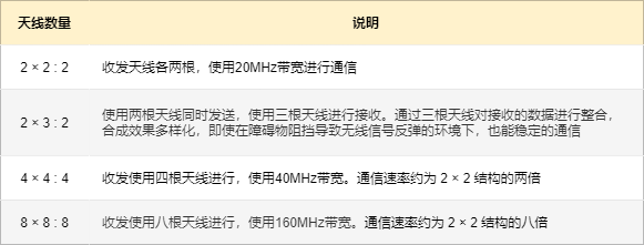 支持 802.11n 标准的 AP 有多个天线。空间流的数量也依赖于天线的数量,通常使用 a × b :c 或 a × b 表示 AP 的天线数量。a 表示发送天线或发送的无线信号数量,b 表示接收天线或接收的无线信号数量,c 表示可以利用的最大空间流数量。比如,现在的 WiFi 6 AP ,也就是 802.11ax 标准的 AP ,最大支持 8 × 8 :8 的数量,表示 8 根发送天线和 8 根接收天线组成,使用 8 个空间流进行无线数据传输。