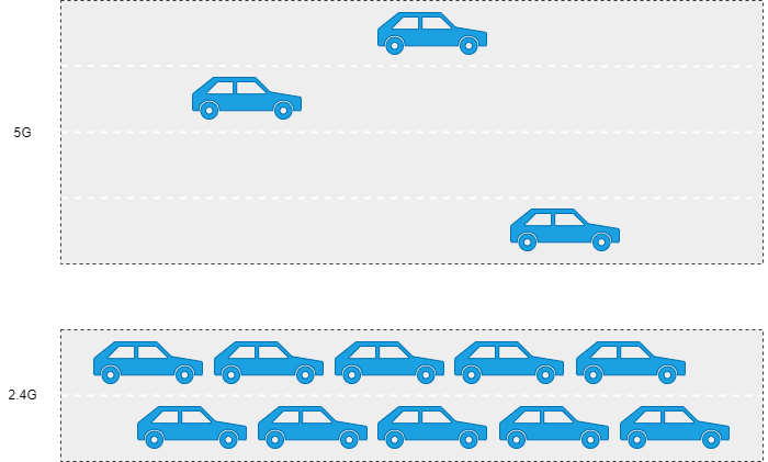 WLAN 的 5G 信道频宽资源就丰富些,一共是 700MHz 的频宽,频率范围是 5.15 ~ 5.85 GHz ,中国一共有 13 个 20MHz 信道,信道编号是 36 、40 、44 、48 、52 、56 、60 、64 、149 、153 、157 、161 、165 ,并且所有信道都是互不干扰的,可以直接使用。