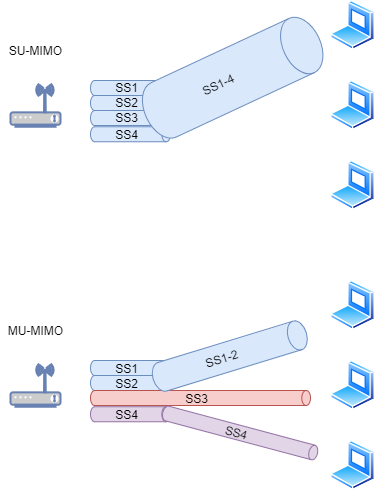MIMO 使用天线的多个无线通信通道,让速率大幅上升。空间上,互相独立的多个天线会同时发送频率相同的无线信号,各个同频信号叫做空间数据流。各空间数据流由发送天线进行路径分割,最终到达多个接收天线。
