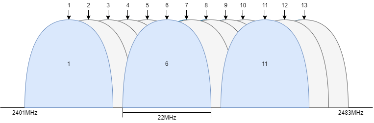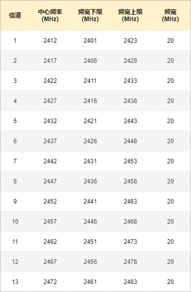 WLAN 的 2.4G 信道频宽是 83.5MHz ,频率范围是 2.4 ~ 2.4835 GHz ,实际一共划分了 14 个信道,中国是使用前面的 13 个信道,信道编号是 1 ~ 13 。每个信道的有效宽度是 20 MHz ,另外还有 2MHz 的强制隔离频带,类似公路上的隔离带。对于中心频率是 2412 MHz 的信道 1 ,频率范围是 2401 ~ 2423 MHz 。