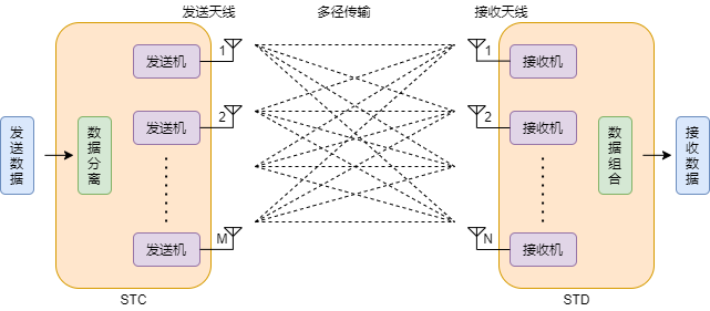 发送方使用空间编码( STC )把发送信号在时间和空间上进行重组,形成并列传输信号,然后通过 M 个天线发送通信电波。接收方通过 N 个天线接收多径传输的无线电波,同样使用空时解码( STD ),对信号进行分离组合,从而成功接收所有信号。