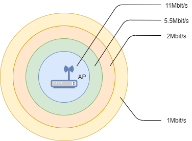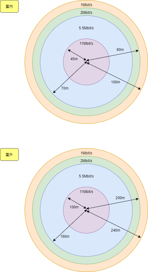 STA 能够进行通信的最大距离半径叫做覆盖范围。根据 STA 和 AP 的距离不同,最大速率也会不同,离 AP 越远,通信延迟越大,数据传输速率也越低。在没有障碍物时,无线网络的覆盖范围是同心圆的形状分布。