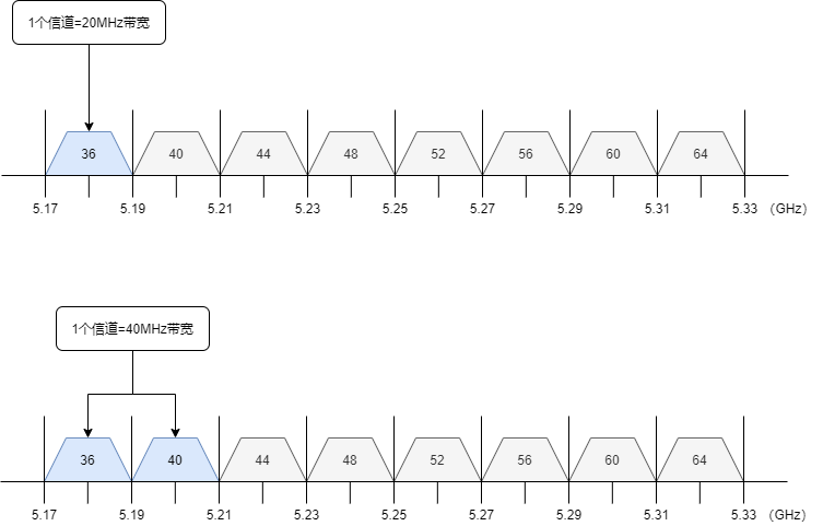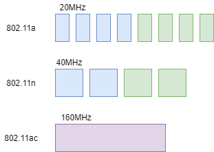 从 802.11n 开始,可以同时使用相邻的信道,组成 40MHz 、80MHz 、160MHz 的频宽进行数据传输。