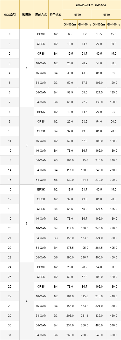IEEE 802.11n 使用 OFDM 调制方式,可以调制方式和符号速率搭配,定义 0 ~ 31 个 MCS 索引,每个 MCS 索引都有一个数据传输速率。