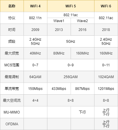 WiFi 6 ,其实就是 802.11ax 标准。对比 WiFi 5 ,WiFi 6 的提升是更完整的频带覆盖、更高阶的调制方式、更全面的 MU-MIMO 、引入 OFDMA 技术、新增 TWT 机制。