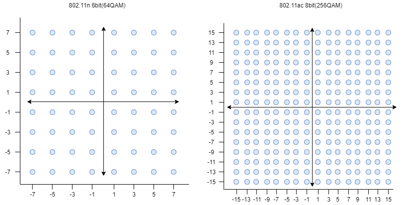 256QAM 调制技术:在信号调制方面,802.11n 是采用 64QAM ,而 WiFi 5 则达到了 256QAM 。QAM 发射信号集一般用星座图表示,每一个星座点对应一个信号,星座点数越多,传输的信息量就越大,常见的形式有 16QAM 、64QAM 、256QAM ,WiFi 5 协议标准采用的是 256QAM ,所以单载波承载的数据量可以达到 8bit ,而802.11n只能达到 6bit 。