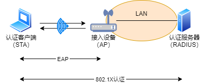 IEEE 802.1X 认证是由认证客户端、接入设备、认证服务器三部分组成。请求认证的终端叫做认证客户端,和终端连接的 AP 、交换机及其它网络设备叫做接入设备。认证方式使用 EAP ,客户端发起认证请求,接入设备会把收到的 EAP 消息封装成 RADIUS 数据帧,转发给认证服务器,当认证服务器完成认证后,接入设备会通知客户端并把客户端作为认证成功的客户端,之后客户端发送的数据帧都会转发到局域网或互联网上。