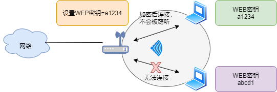 WEP ,全称 Wired Equivalent Privacy ,即有线等效保密。WEP 加密是最早在无线加密中使用的技术,基于 RC4 算法的密钥对数据进行加密,这个密钥叫做 WEP key 。
