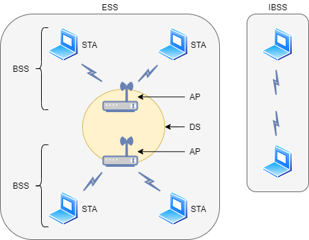 IBSS ,全称 Independent Basic Service Set ,即 独立基本服务集,包含一个及以上 STA 的无线网络,也叫做 ad-hoc 无线网络,无法访问 DS 时使用的模式。