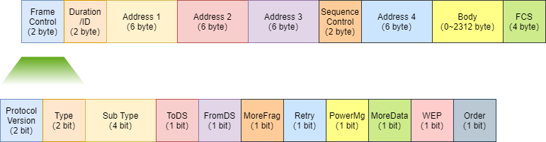 Type :类型,表示数据帧的功能,有控制帧、管理帧、数据帧三种。