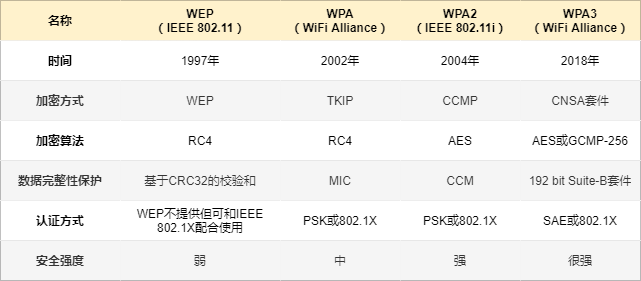 为了防止无线通信被窃听和篡改,要在无线通信过程中,对信息进行加密。WLAN 加密有 WEP 、WPA 、WPA2 、WPA3 等标准。