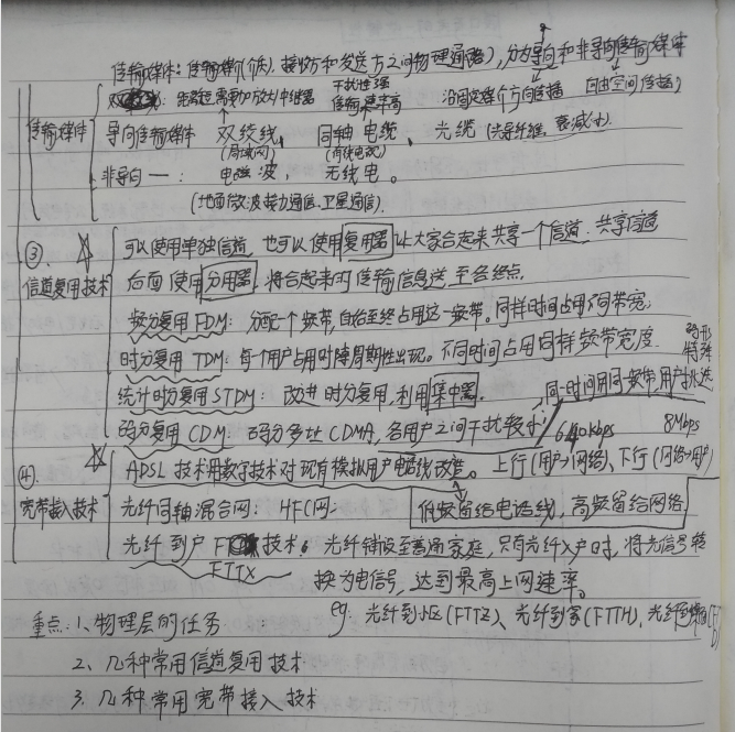 (3)ADSL技术(用数字技术对现有模拟用户的电话线进行改造,低频给电话,高频给网络);光纤到户FTTx技术(光纤铺设到普通家庭,只有光纤入户时,蒋光信号转换为电信号,达到最高效率。)