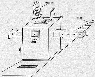 所谓的图灵机就是指一个抽象的机器,它有一条无限长的纸带,纸带分成了一个一个的小方格,每个方格有不同的颜色。有一个机器头在纸带上移来移去。机器头有一组内部状态,还有一些固定的程序。在每个时刻,机器头都要从当前纸带上读入一个方格信息,然后结合自己的内部状态查找程序表,根据程序输出信息到纸带方格上,并转换自己的内部状态,然后进行移动。