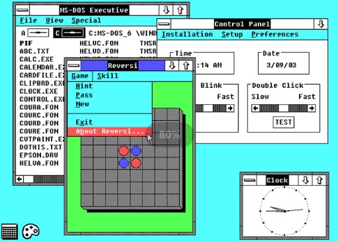 微软作为一个图形界面的狂热者,在图形界面上的有着执着的热情,1985年,微软终于在图形用户界面大潮中占据了一席之地,Windows1.0是其第一款基于 GUI 的操作系统 。使用了 32×32 像素的图标以及彩色图形,其最有趣的功能是模拟时钟动画图标。