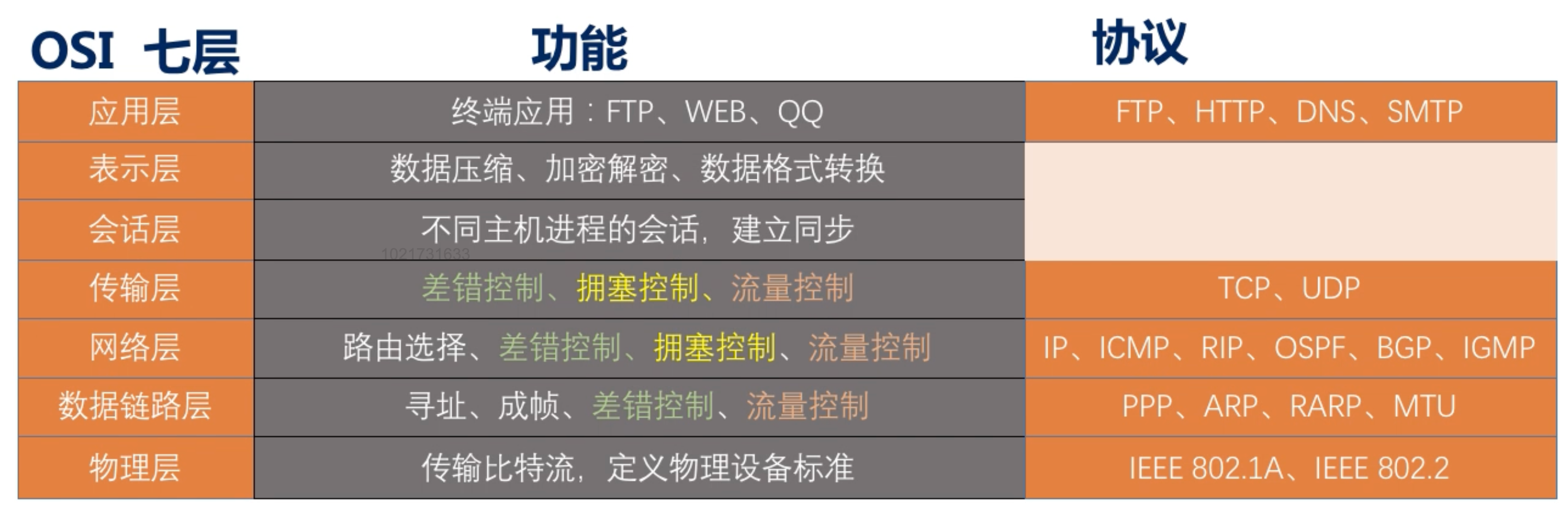 - 差错控制:是通信两点之间约定的特定检错规则;如奇偶校验码。