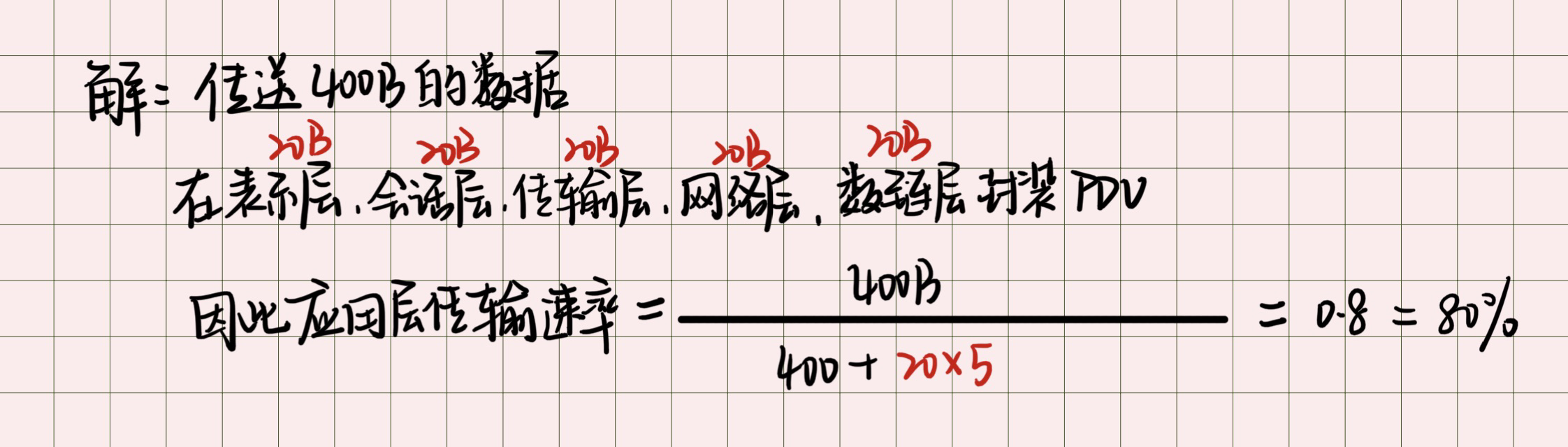 034.[2017 统考真题]假设OSI参考模型的应用层欲发送400B的数据(无拆分),除物理 层和应用层外,其他各层在封装 PDU 时均引入20B的额外开销,则应用层的数据传 输效率约为( )。 A.80% B.83% C.87% D.91%????详细题解:
