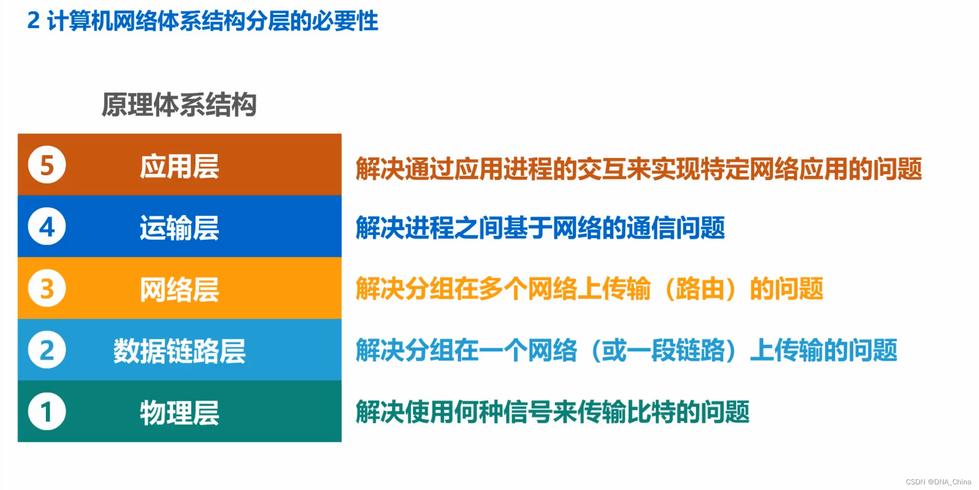 - 至此,我们将实现计算机网络所需要解决的各种主要问题,分别划归到了物理层、数据链路层、网络层运输层和应用层,进而构成了五层协议体系的原理体系结构。