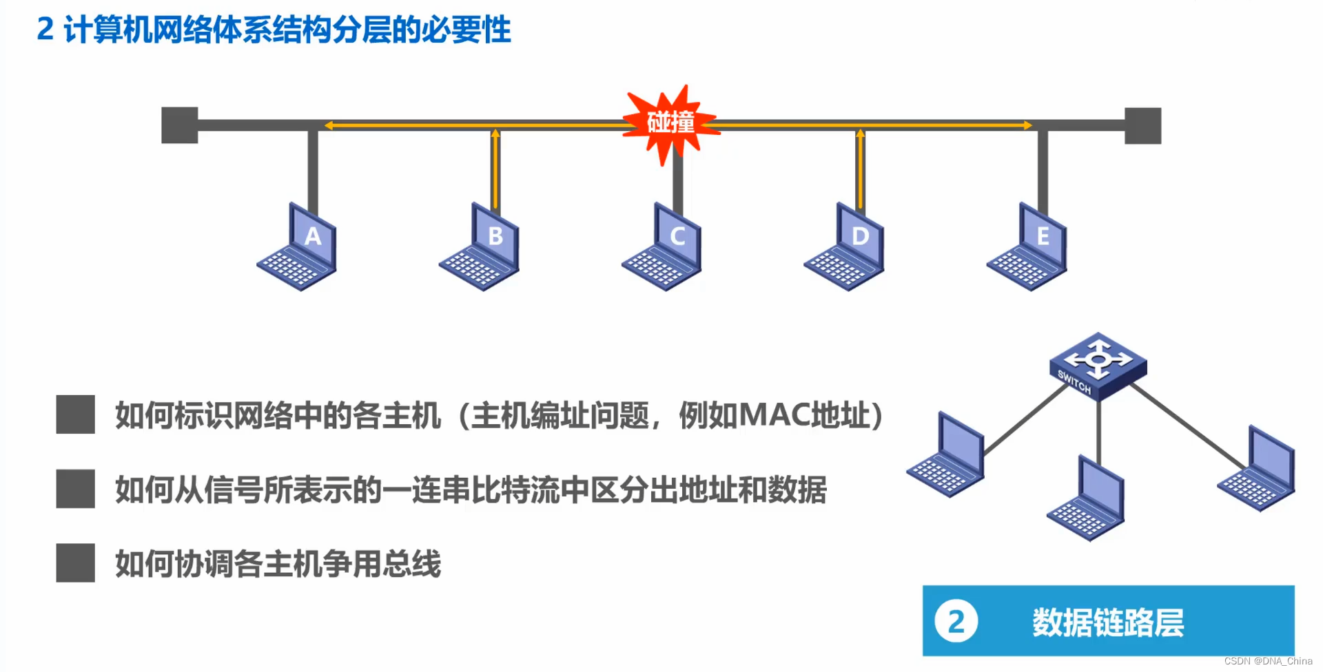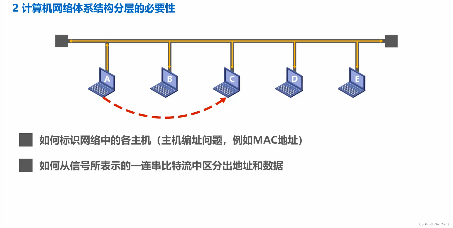 - 假设,我们已经解决了物理层的问题,也就是说主机间可以发送信号来传输比特0或者是1了。我们来看看,在这样一个总线性的网络上,还面临什么需要解决的问题。