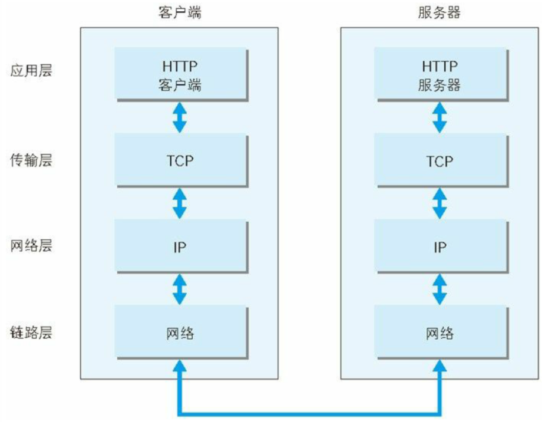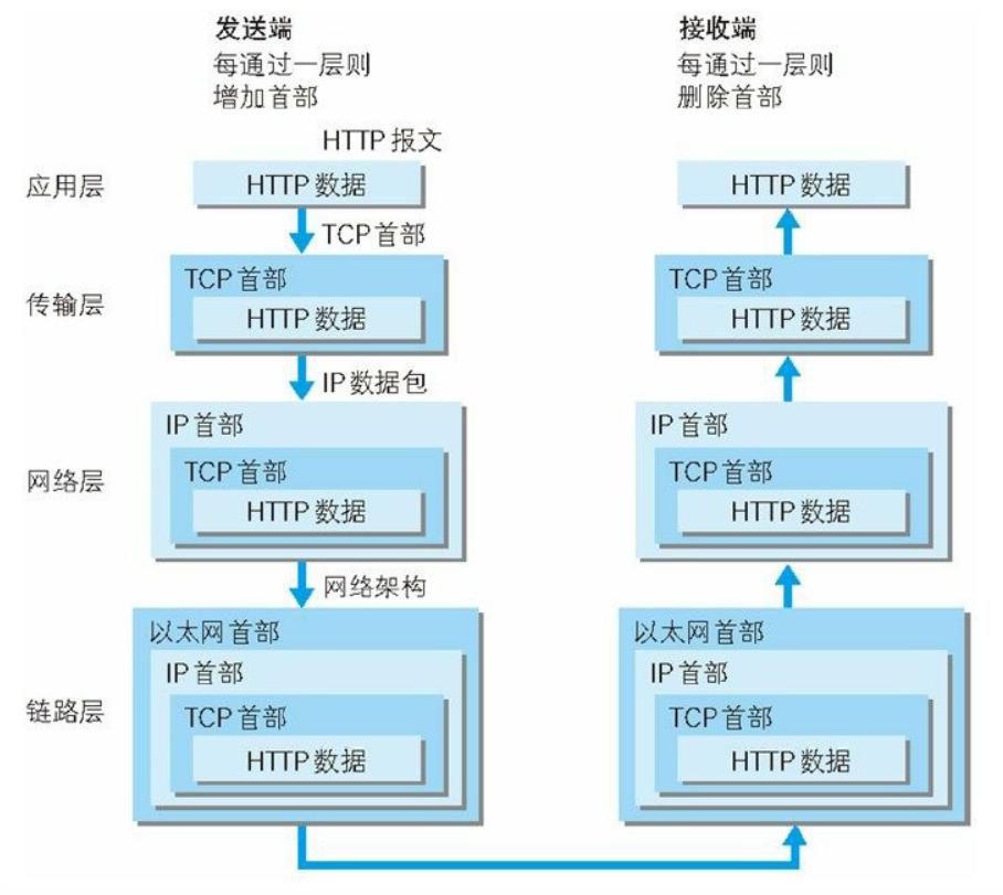利用 TCP/IP 协议族进行网络通信时,会通过分层顺序与对方进行通信。发送端从应用层往下走,接收端则从链路层往上走。如下: