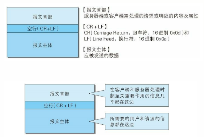 HTTP 报文大致可分为报文首部和报文主体两部分。两者由最初出现的空行(CR+LF)来划分。通常,并不一定有报文主体。如下: