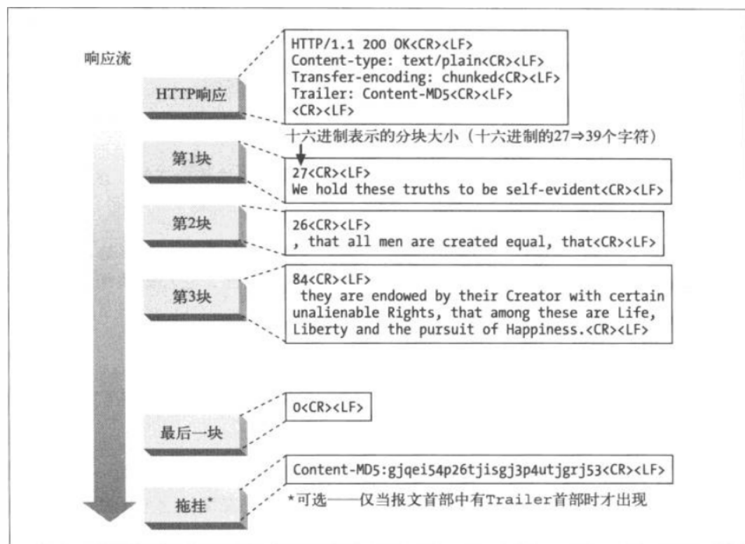- 分块编码为这种困难提供了解决方案,只要允许服务器把主体分块发送,说明每块的大小就可以了。因为主体是动态创建的,服务器可以缓冲它的一部分,发送其大小和相应的块,然后在主体发送完之前重复这个过程。服务器可以用大小为 0 的块作为主体结束的信号,这样就可以继续保持连接,为下一个响应做准备。