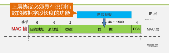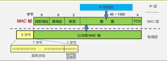 为了接收端迅速实现位同步,向下传到物理层时还要在前面插入8字节(由硬件生成: 7 字节前同步码(1和0交替码)和 1 字节帧开始定界符。