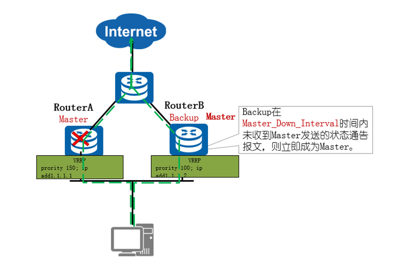 Backup路由器(Virtual Router Backup):一组没有承担转发任务的VRRP设备,当Master设备出现故障时,它们将通过竞选成为新的Master设备,如RouterB。
