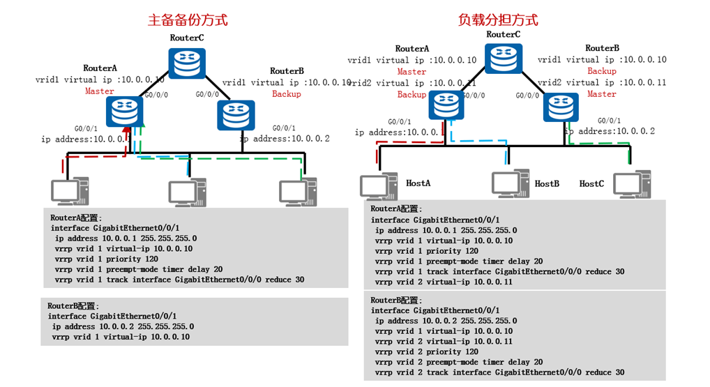 以上就是要减肥狗最近收集整理的关于VRRP技术详解和实战演练VRRP诞生的背景介绍VRRP的工作原理VRRP主备备份工作过程VRRP主备切换过程VRRP故障场景VRRP负载分担工作过程VRRP的基本配置的全部内容,更多相关VRRP技术详解和实战演练VRRP诞生内容请搜索靠谱客的其他文章。
