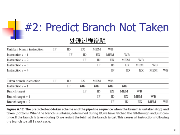 2.预测分支失败:沿失败的分支继续处理指令,即允许分支 指令后的指令继续在流水线中流动。如果确定分支失败,流水线正常流动;否则,将分支之后的指令作废(idle),按 分支目标地址重新执行。下图是在ID段计算跳转地址,预测失败(分支指令执行)只停顿一个时钟周期。如左下图所示。