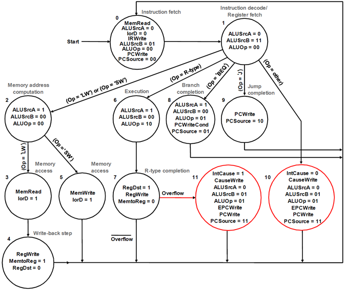 增加一个检查异常(中断)是否发生的步骤。道理与单周期同。