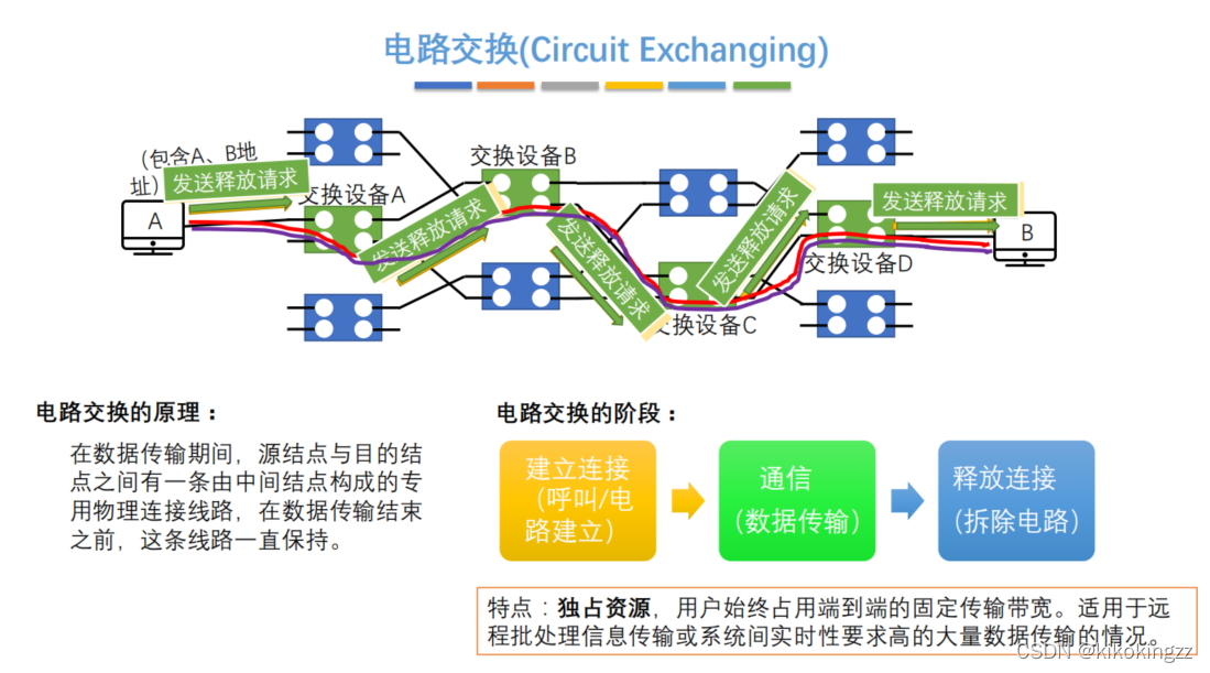 在进行数据传输前,两个结点之间必须先建立一条专用的、双方独占的物理通信路径(由通信双方之间的交换设备和链路逐段连接而成),该路径可能经过许多中间结点。这一路径在整个数据传输期间一直被独占,直到通信结束后才被释放。因此,电路交换技术分为三个阶段:连接建立、数据传输和连接释放。