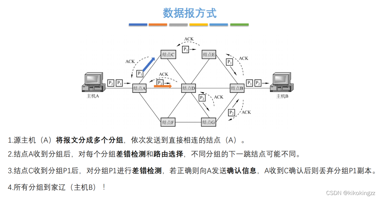 网络结点根据控制信息把分组送到下一个结点,下一个结点接收到分组后,暂时保存并排队等待传输,然后根据分组控制信息选择它的下一个结点,直到到达目的结点。