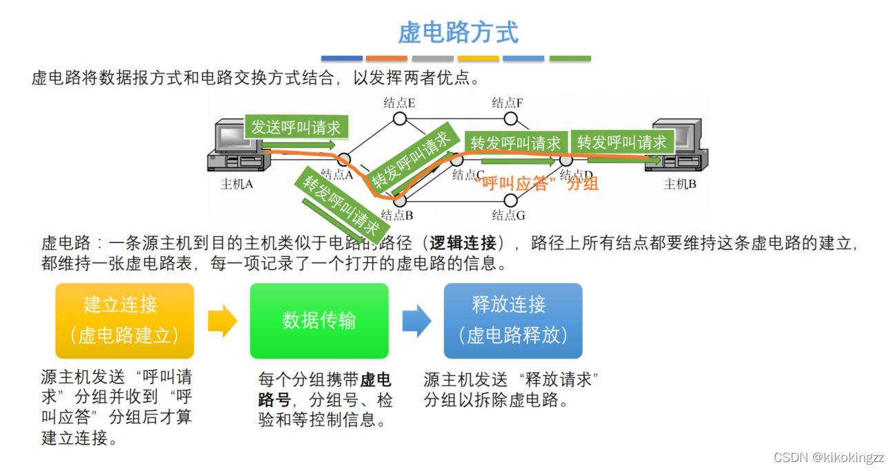 A1:细节来说,会建立连接时,主机A会发送一个【发送呼叫请求】给交换设备A,该请求中包含了主机A和主机B的地址,交换设备A通过路由选择算法,选择了下一跳的节点为交换设备B,将【发送呼叫请求】转发给B;重复该过程一直到最终将【发送呼叫请求】发送给B,如果B可以接收A的连接请求的话,就会“原路返回”,即沿着D-C-B-A-主机A,发送一个【呼叫应答】,此时建立连接。