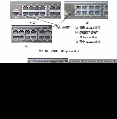 如果交换机备有“UpLink(级联)”端口,如图7.10所示,则可直接采用这个端口进行级联。在级联时,上一级交换机中要连到交换机的普通端口,下层交换机则连到专门的“UpLink(级联)”端口,如图7.11所示。