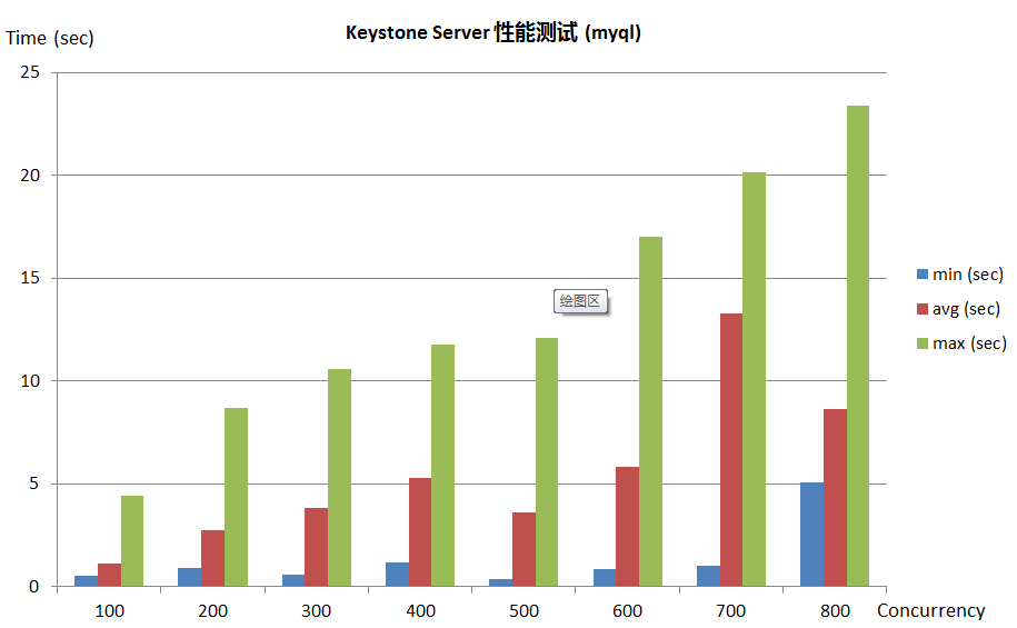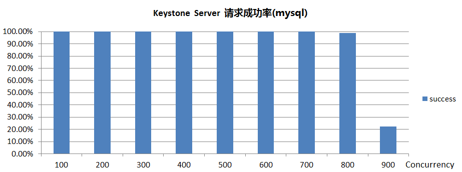 注:以创建用户为例,一个并发数(Concurrency),包含两个 HTTPS 请求(一个为申请 token,另一个为创建用户)。此处仅给出 mysql(单点) 数据库下keystone server 的并发性能。